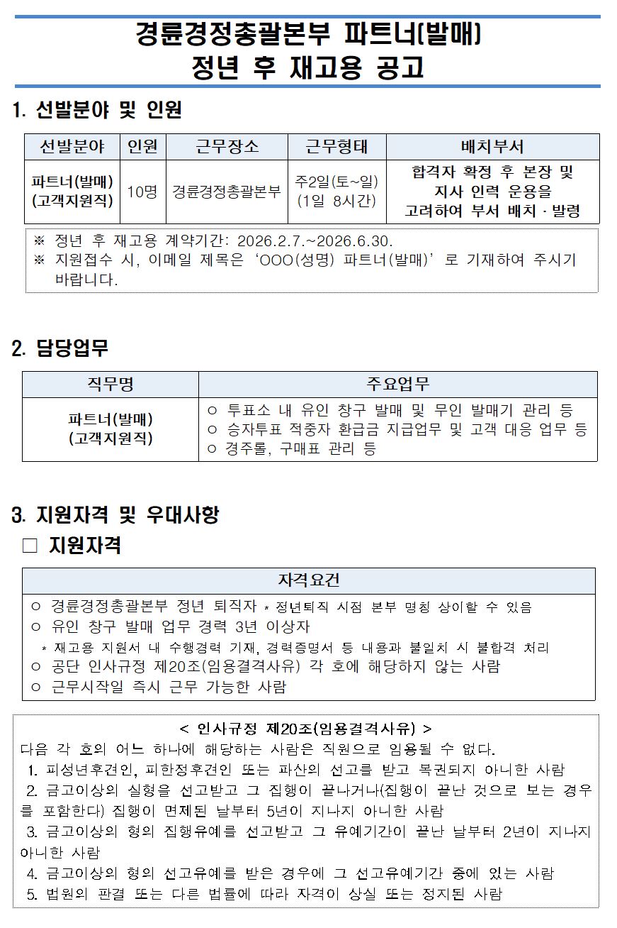 경륜경정총괄본부 파트너(발매) 정년 후 재고용 공고